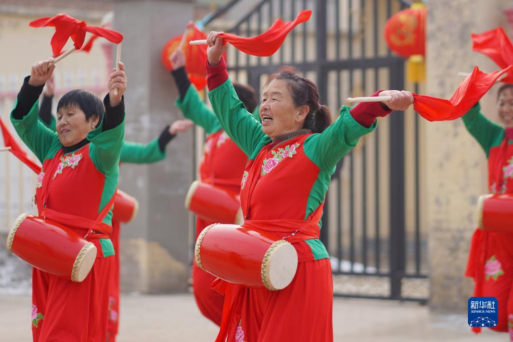 河北省邢臺市內丘縣史村屯村村民在廣場排練腰鼓(2022年1月29日攝)。新華社發(劉繼東 攝)