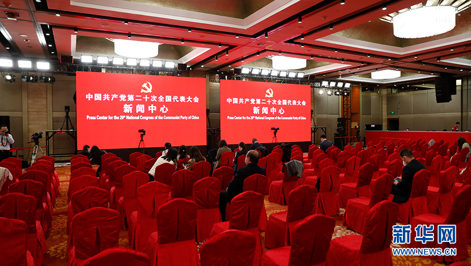 10月17日(星期一)10:00,二十大新聞中心將在梅地亞新聞中心二層新聞發布廳舉辦第一場記者招待會。圖為記者招待會前