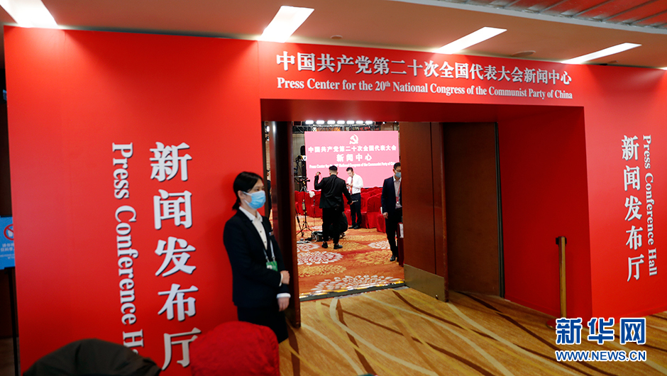 10月17日(星期一)15:00,二十大新聞中心將在梅地亞新聞中心二層新聞發布廳舉辦第二場記者招待會。圖為記者招待會前新世紀日航飯店三層世紀廳分會場。(新華網 陳杰 攝)