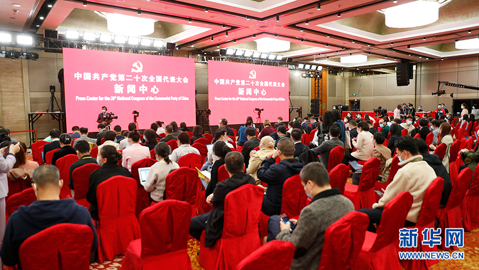 10月17日(星期一)15:00,二十大新聞中心將在梅地亞新聞中心二層新聞發布廳舉辦第二場記者招待會。圖為記者招待會前新世紀日航飯店三層世紀廳分會場。(新華網 陳杰 攝)