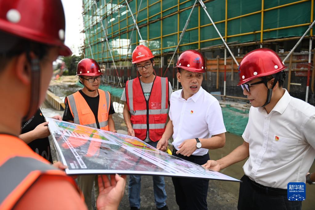 在浙江省寧波市奉化區蕭王廟街道滕頭村,二十大代表、滕頭村黨委書記、村委會主任傅平均(右二)在村黨群服務中心大樓建設工地察看施工進展(2022年9月16日攝)。新華社記者 黃宗治 攝