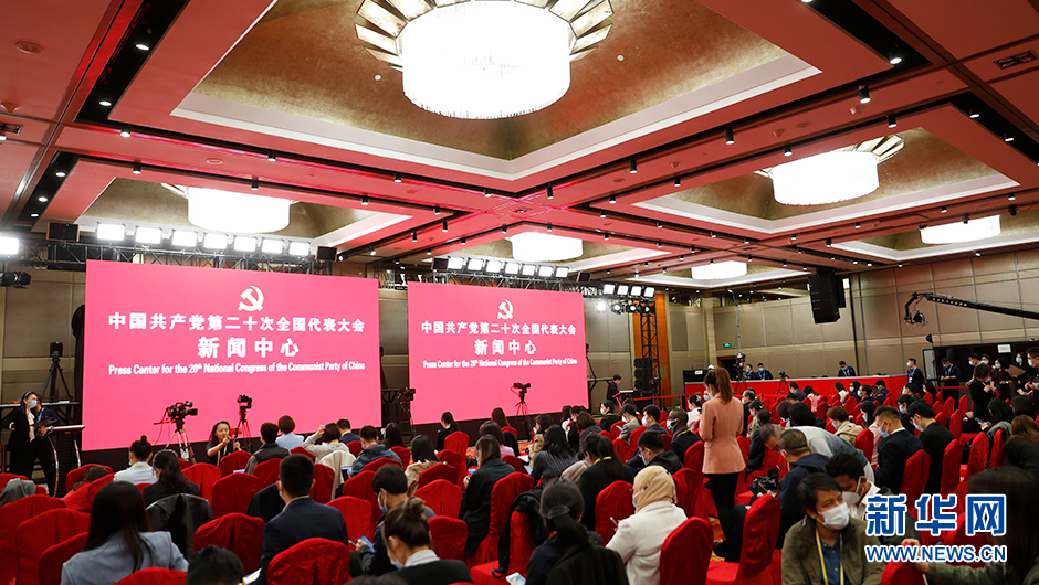 10月18日(星期二)15:00,二十大新聞中心將在梅地亞新聞中心二層新聞發布廳舉辦第一場集體采訪。圖為第一場集體采訪前新世紀日航飯店三層世紀廳分會場。(新華網 陳杰 攝)