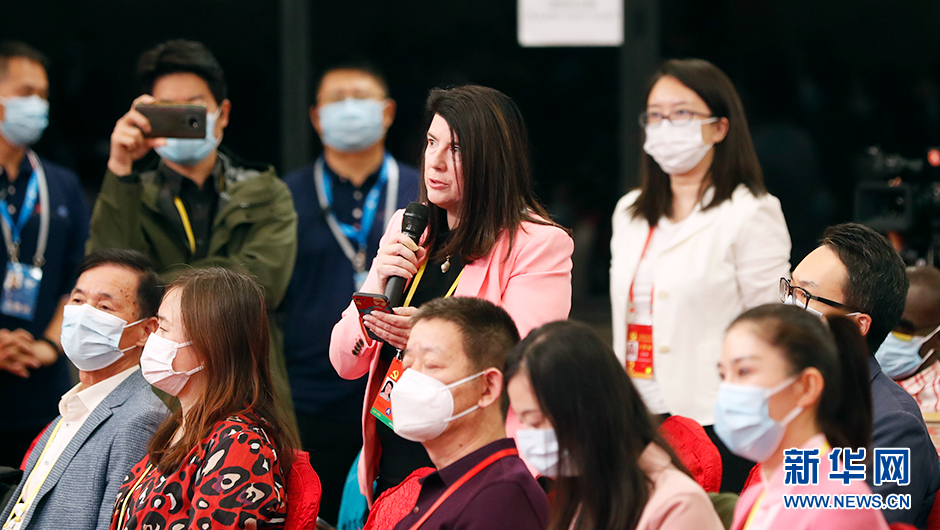 10月18日(星期二)15:00,二十大新聞中心在梅地亞新聞中心二層新聞發布廳舉辦第一場集體采訪。圖為哥斯達黎加民族報記者在分會場提問。(新華網 陳杰 攝)