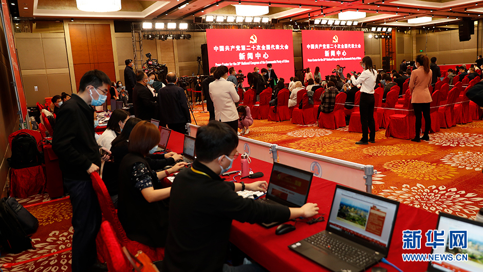 10月18日(星期二)19:30,二十大新聞中心將在梅地亞新聞中心二層新聞發布廳舉辦第二場集體采訪。圖為記者在現場工作。(新華網 陳杰 攝)