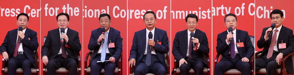 10月19日,中國共產黨第二十次全國代表大會新聞中心舉行集體采訪。山東、河南、湖北、湖南、廣東、廣西、海南代表團新聞發言人出席,介紹代表團學習討論二十大報告情況,并回答記者提問(拼版照片)。
