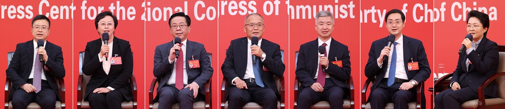 10月19日,中國共產黨第二十次全國代表大會新聞中心舉行集體采訪。重慶、四川、貴州、云南、西藏、陜西、甘肅代表團新聞發言人出席,介紹代表團學習討論二十大報告情況,并回答記者提問(拼版照片)。