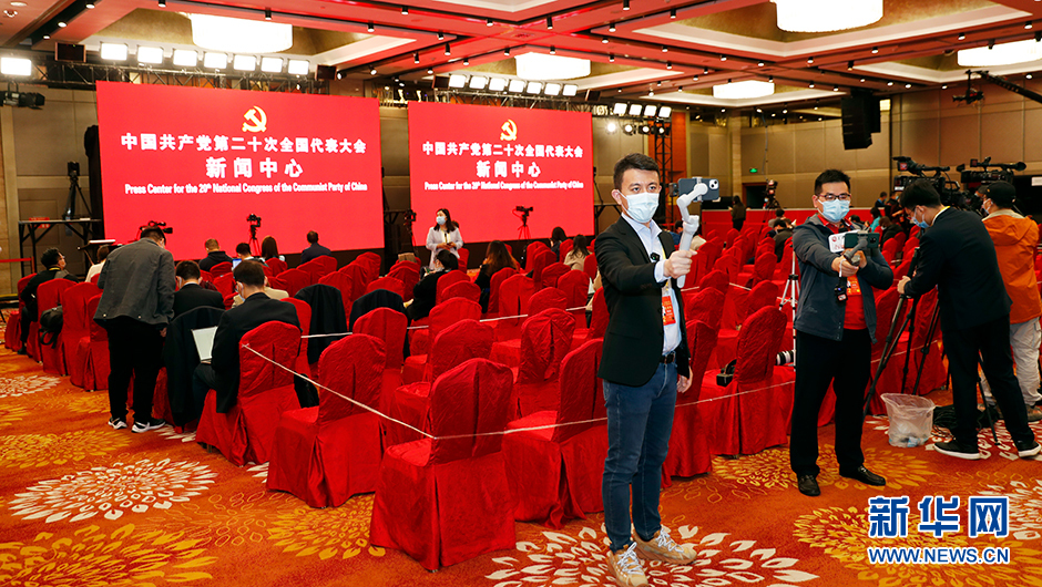 10月19日(星期三)15:00,二十大新聞中心將在梅地亞新聞中心二層新聞發布廳舉辦第三場集體采訪。圖為集體采訪前新世紀日航飯店三層世紀廳分會場現場。(新華網 陳杰 攝)