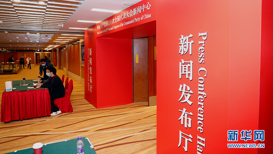 10月19日(星期三)19:30,二十大新聞中心將在梅地亞新聞中心二層新聞發布廳舉辦第四場集體采訪。圖為集體采訪前新世紀日航飯店三層世紀廳分會場。(新華網 陳杰 攝)