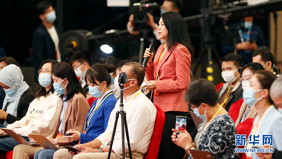 10月20日(星期四)19:30,二十大新聞中心在梅地亞新聞中心二層新聞發布廳舉辦第五場集體采訪。圖為中央廣播電視總臺記者在分會場提問。(新華網 陳杰 攝)