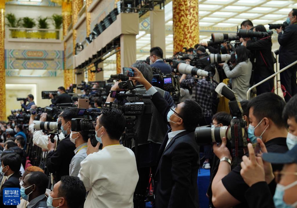 10月23日,中外記者在北京人民大會堂報道新一屆中共中央政治局常委首次集體亮相。新華社記者 才揚 攝