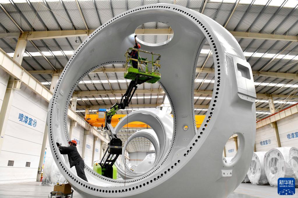在山東省惠民縣風電裝備產業基地涂裝車間,工作人員對風電輪轂進行涂裝(2022年6月7日攝)。新華社記者 郭緒雷 攝