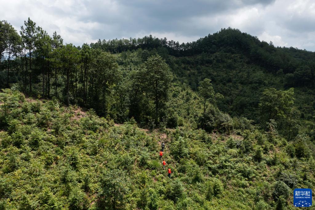 在浙江省杭州市臨安區太湖源鎮上陽村重陽塢,志愿者在“碳中和林”進行日常巡查(2021年7月20日攝,無人機照片)。新華社記者 徐昱 攝