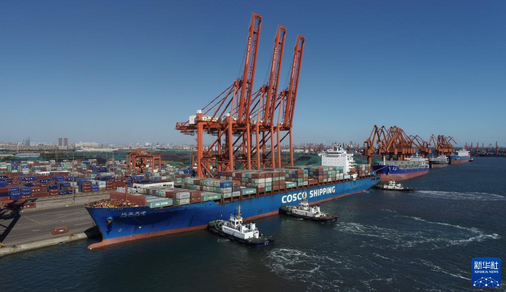 一艘輪船在拖輪的協助下向唐山港京唐港區集裝箱碼頭靠泊(2021年10月23日攝,無人機照片)。新華社記者 朱旭東 攝