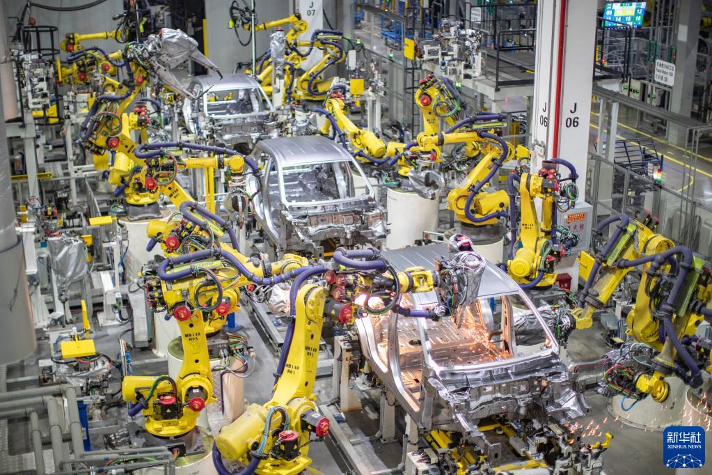 重慶一家新能源汽車企業使用智能化焊接機器人進行焊接作業(2021年4月2日攝)。新華社記者 黃偉 攝