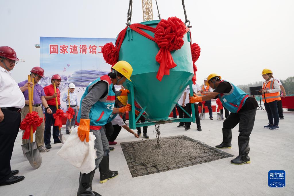 2018年6月26日,在北京國家速滑館施工現場,工人澆筑地下結構最后一塊頂板混凝土。新華社記者 鞠煥宗 攝