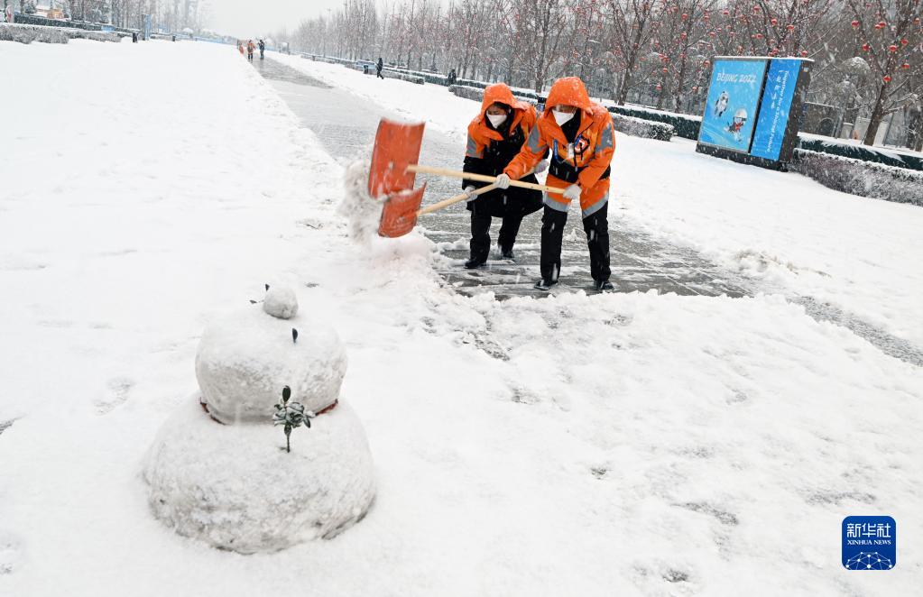 2022年2月13日,工作人員在北京冬奧會和冬殘奧會主媒體中心外清掃積雪。新華社記者 武巍 攝