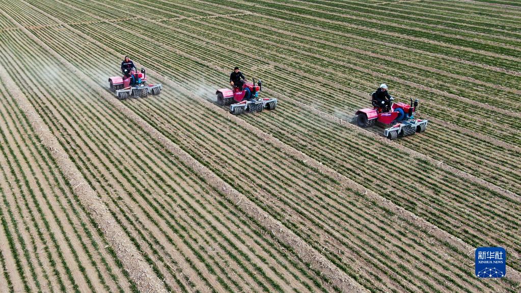 2月17日,在山東省聊城市莘縣妹冢鎮,農民在麥田里進行鎮壓保墑作業(無人機照片)。新華社記者 郭緒雷 攝