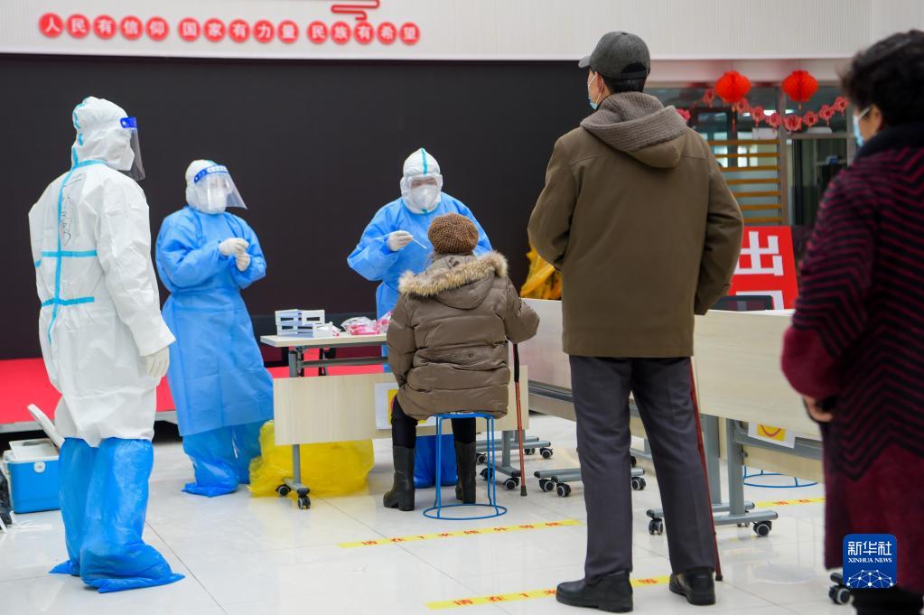 在內蒙古滿洲里市東山街道辦事處怡園社區府欣小區A區核酸采樣點,工作人員為居民做核酸采樣(2021年11月29日攝)。新華社記者 李志鵬 攝