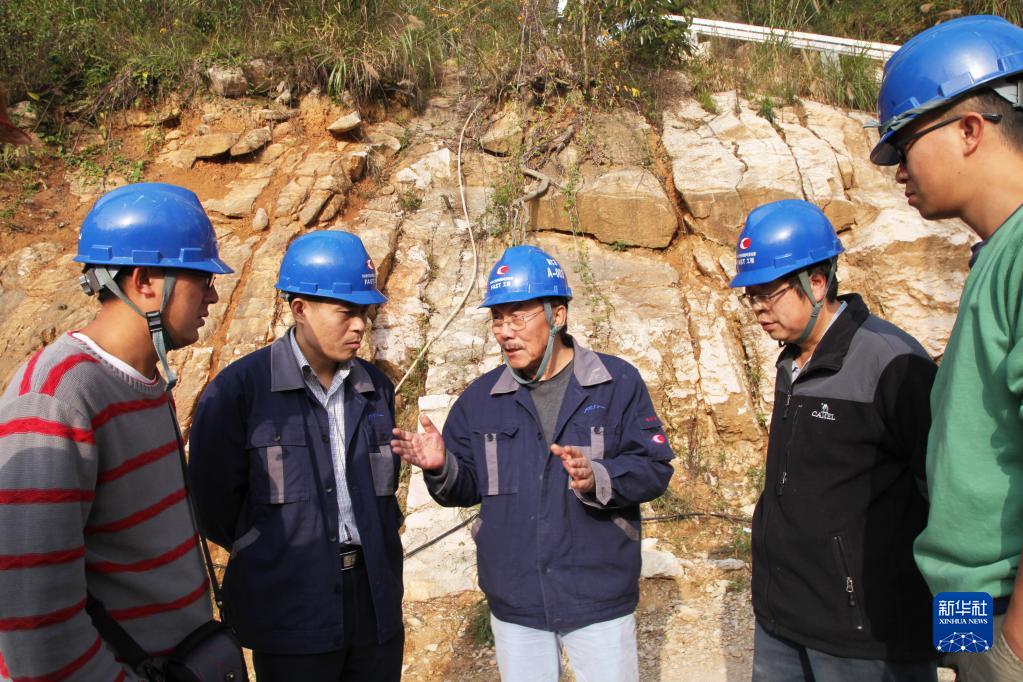 天文學家南仁東(中)與工程技術人員在大窩凼施工現場檢查施工進展(2014年12月1日攝)。新華社發(中科院國家天文臺供圖)