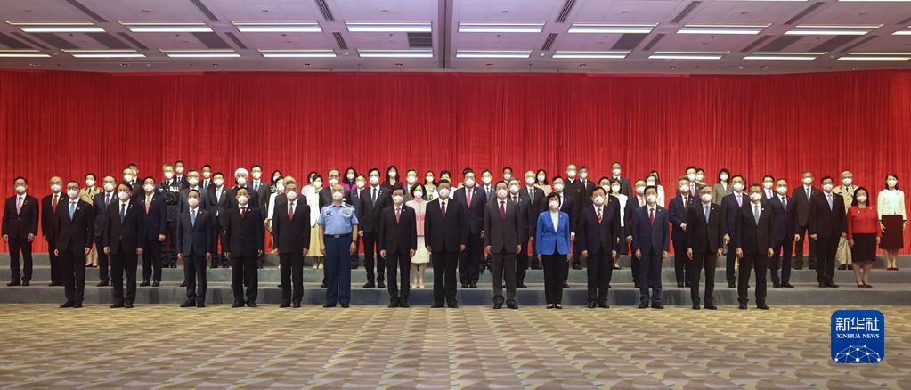 7月1日上午,國家主席習近平在香港特別行政區行政長官李家超的陪同下,會見香港特別行政區新任行政、立法、司法機關負責人。新華社記者 鞠鵬 攝