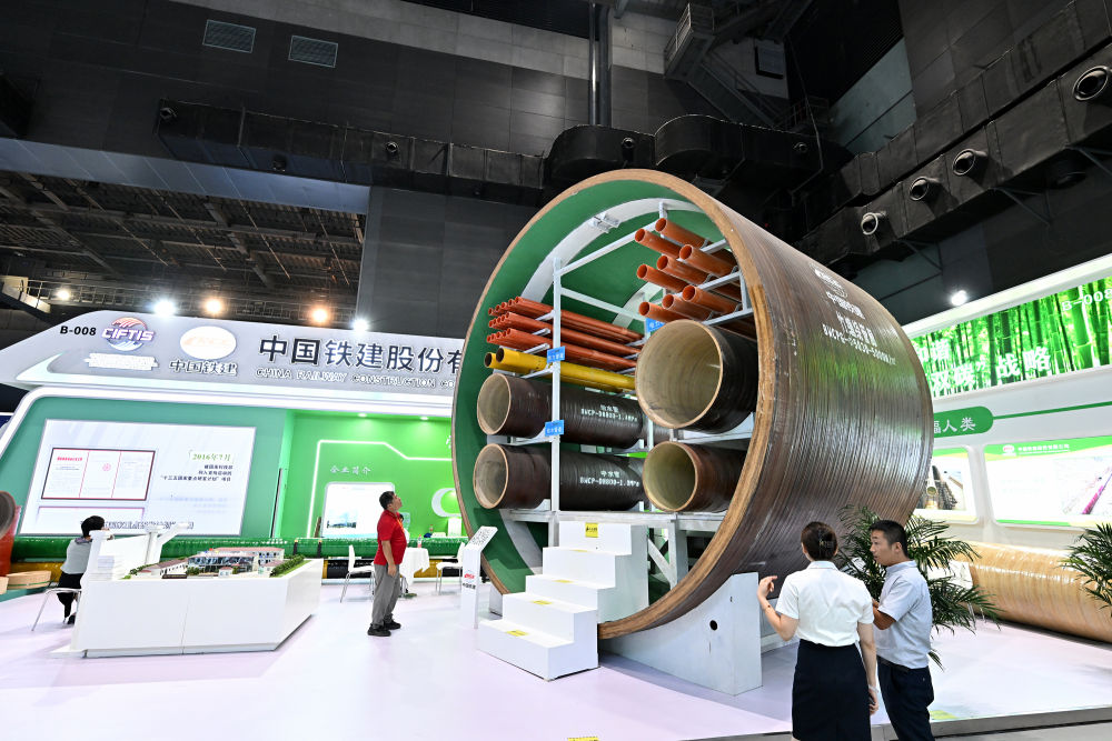 9月2日,在國家體育館舉行的服貿會環境服務專題展上,客商在中國鐵建展位竹纏繞管廊旁了解信息。新華社記者 李鑫 攝