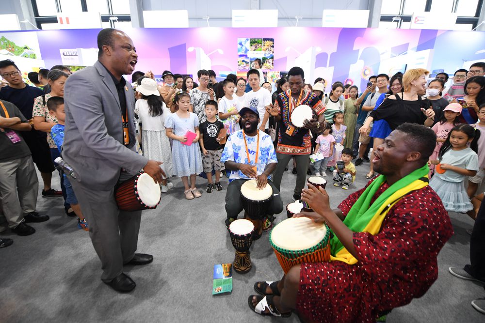 9月2日,在“一帶一路”沿線國家特色文化展示活動上,加納共和國駐華大使館展區的工作人員在現場即興表演。新華社記者 鞠煥宗 攝