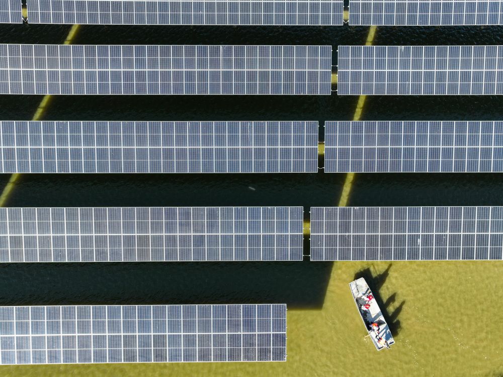 2023年11月17日,在江蘇省連云港市灌云縣圩豐鎮洋橋村,國網連云港供電公司員工對漁光互補發電項目進行巡檢(無人機照片)。近年來,連云港市積極踐行生態優先、綠色發展理念,依托地理優勢和豐富的光照條件,構建清潔低碳、安全高效的新型能源體系,大力發展光伏、風能等清潔能源,助力綠色低碳發展。