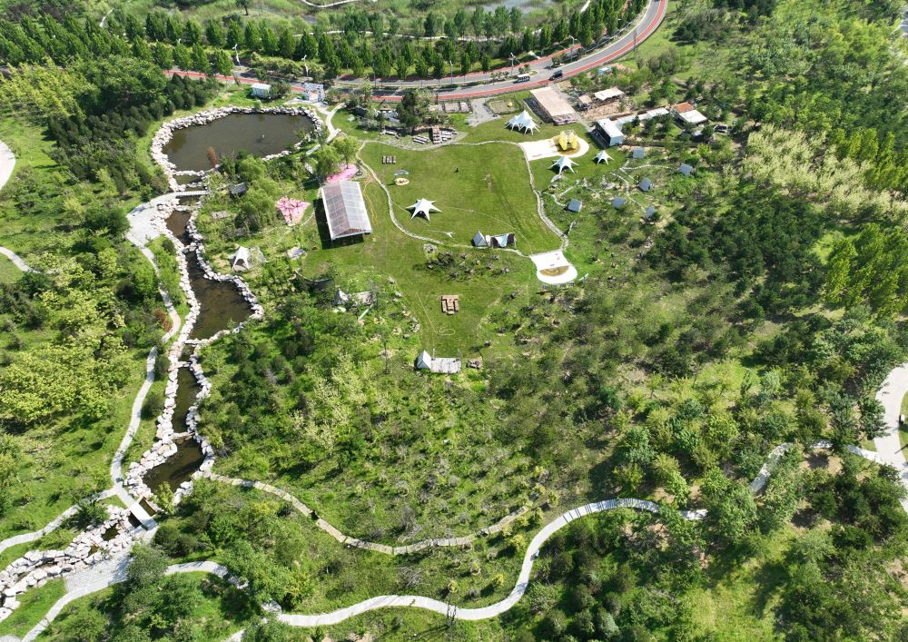 2023年7月25日拍攝的河北唐山花海景區(無人機照片)。該景區曾是采煤塌陷區,2018年以來,唐山市開平區持續對這一區域進行生態修復,并引入露營、餐飲、游樂園等旅游業態,將其打造成為“城市后花園”和生態城市建設的新名片,實現“礦區變景區”的“綠色轉身”。