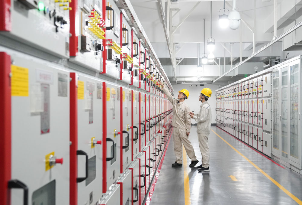 2023年11月4日,第六屆中國國際進口博覽會開幕前夕,國網上海青浦供電公司工作人員在變電站內巡視。此屆進博會通過省間綠電交易的方式,成功采購綠電800萬千瓦時,覆蓋本屆進博會展前、展中、展后期間的全部用電量,也標志著進博會首次實現全綠電辦展。
