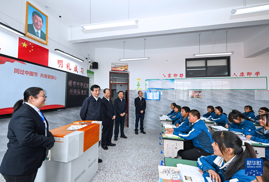 7月1日至3日,中共中央政治局常委、全國政協主席王滬寧在四川甘孜、阿壩調研。這是7月3日王滬寧在阿壩縣中學了解開展愛國主義教育和民族團結進步教育情況。新華社記者 饒愛民 攝