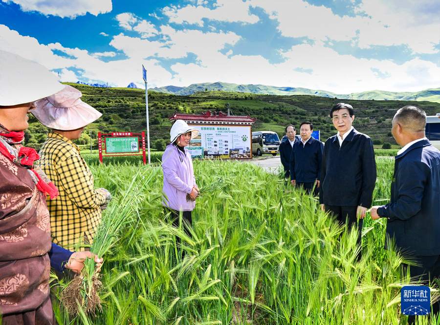 7月1日至3日,中共中央政治局常委、全國政協主席王滬寧在四川甘孜、阿壩調研。這是7月1日王滬寧在甘孜縣了解青稞生產情況。新華社記者 饒愛民 攝