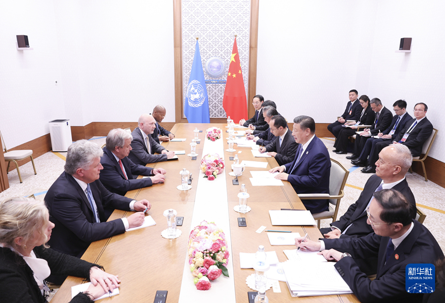 當地時間7月4日下午,國家主席習近平在阿斯塔納出席上海合作組織峰會期間會見聯合國秘書長古特雷斯。新華社記者 龐興雷 攝