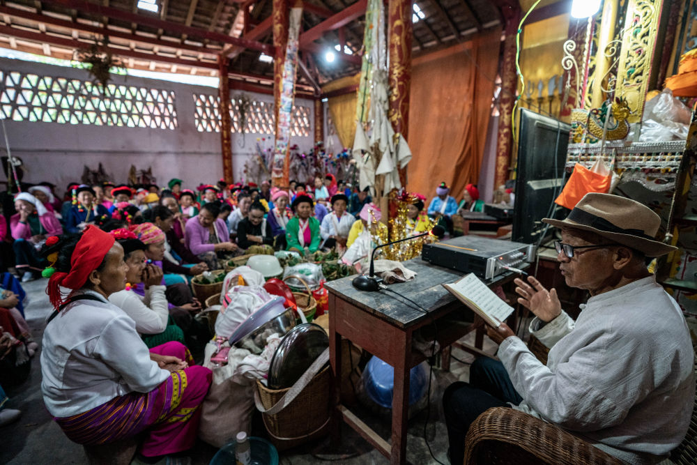 2023年9月14日,在云南省普洱市瀾滄拉祜族自治縣景邁山芒景村的文化活動室,布朗族老人蘇國文(右)給村民講課。新華社記者 胡超 攝