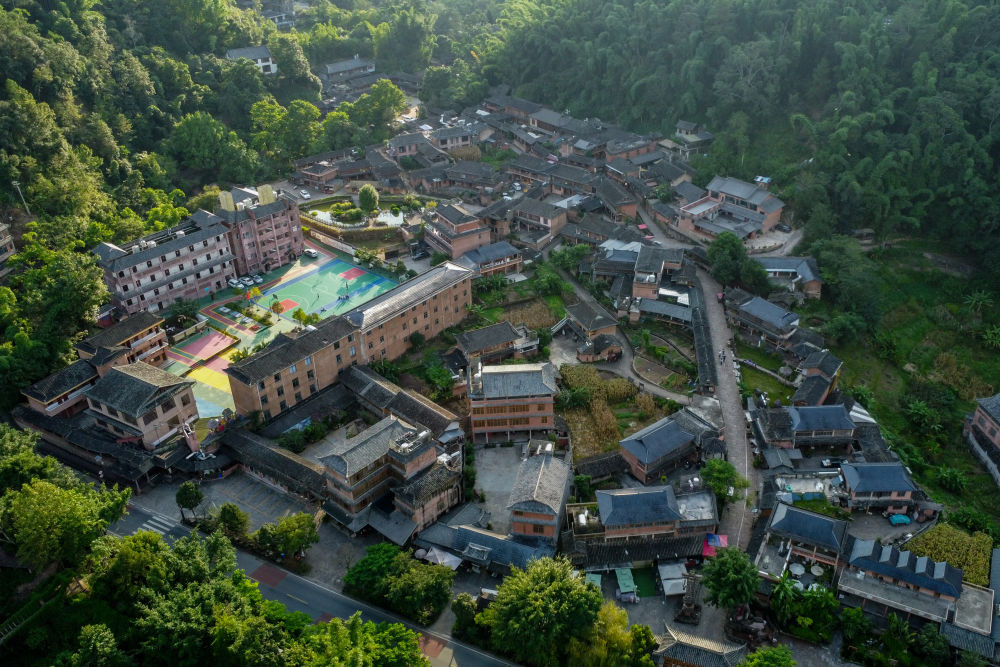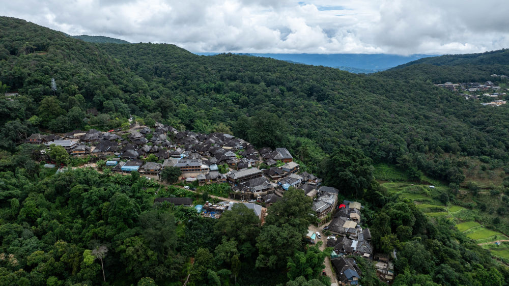 被山林與茶園環繞的云南省普洱市瀾滄拉祜族自治縣景邁山翁基古寨一景(2024年9月13日攝,無人機照片)。新華社記者 胡超 攝