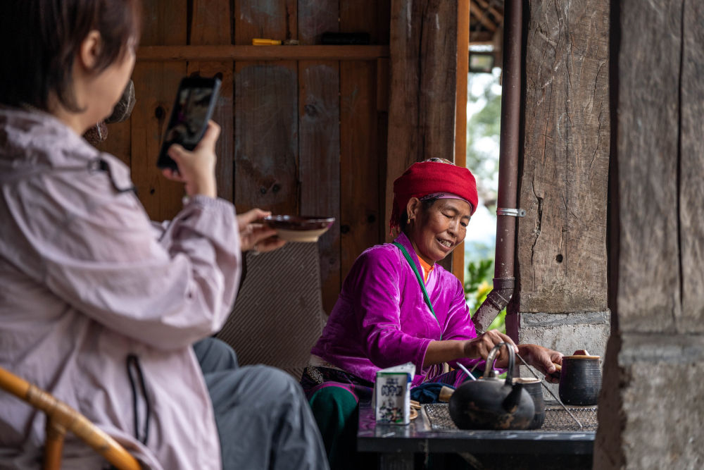2024年9月13日,游客在云南省普洱市瀾滄拉祜族自治縣景邁山翁基古寨拍攝布朗族老人制作罐烤奶茶。新華社記者 胡超 攝
