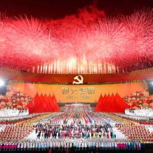 2021年6月28日晚,慶祝中國共產黨成立100周年文藝演出《偉大征程》在北京國家體育場盛大舉行。這是文藝演出結束,全場共同高唱《沒有共產黨就沒有新中國》。新華社記者 黃敬文 攝