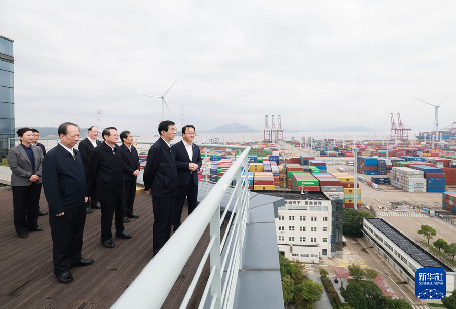 10月15日至17日,中共中央政治局常委、全國政協主席王滬寧在浙江省寧波市、溫州市調研。這是16日上午,王滬寧在寧波舟山港穿山港區了解生產運營和自由貿易試驗區建設情況。新華社記者 王曄 攝