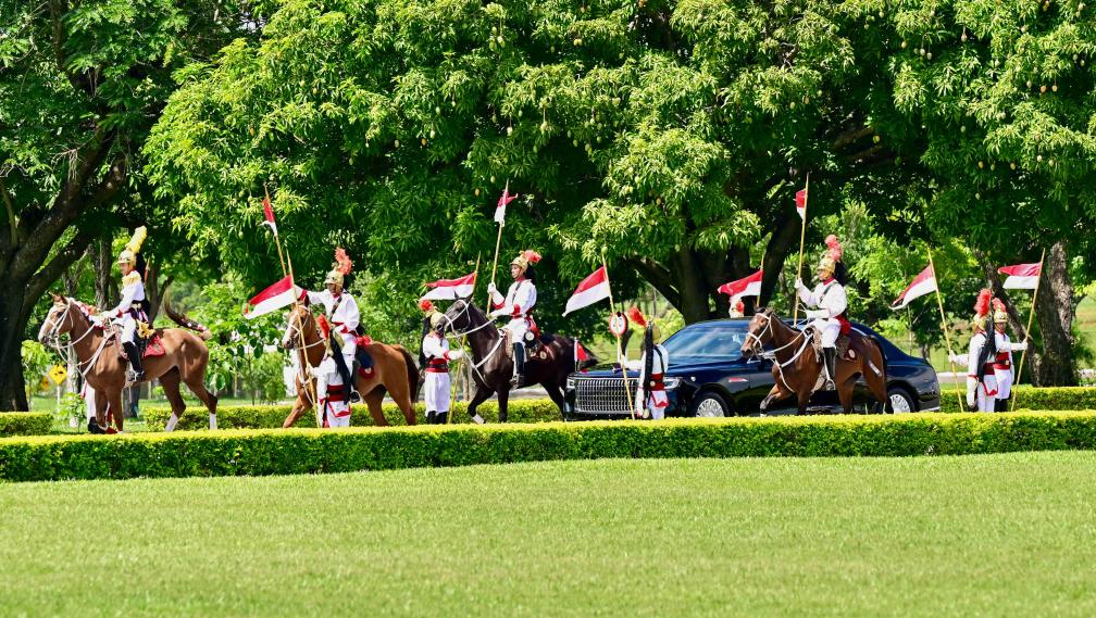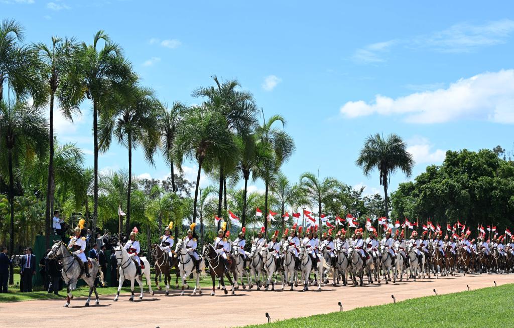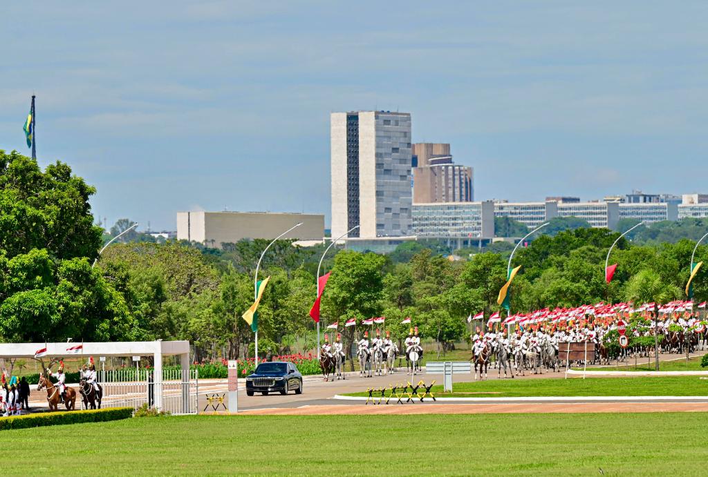在120名龍騎兵護衛下,習近平主席乘車抵達黎明宮前廣場。盧拉總統和夫人羅桑熱拉熱情迎接習近平主席,并為習近平主席舉行隆重盛大歡迎儀式。