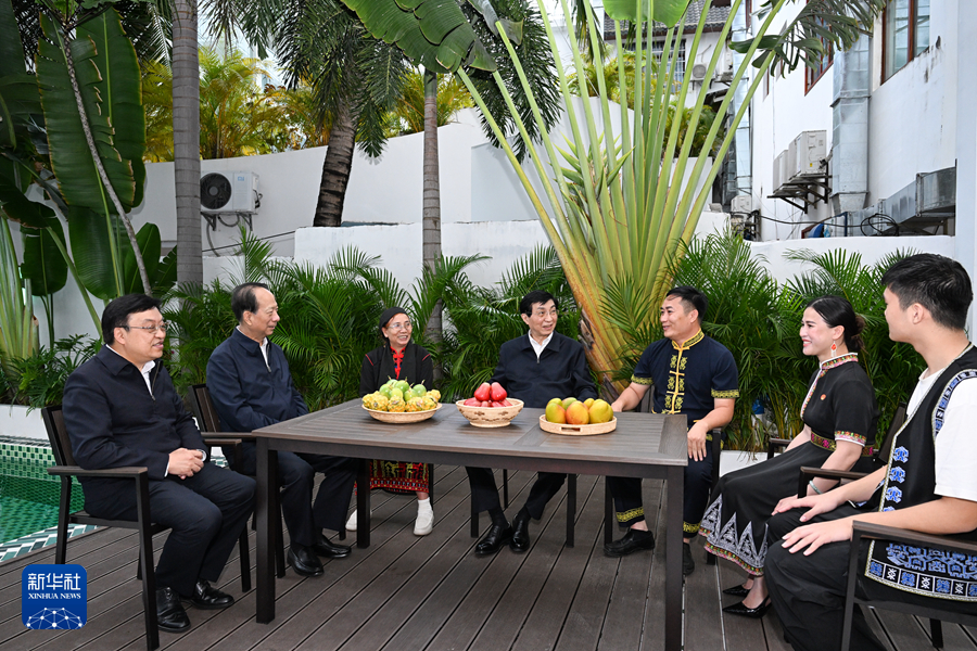 11月20日至22日,中共中央政治局常委、全國政協主席王滬寧在海南調研。這是11月21日,王滬寧在三亞市吉陽區博后村看望黎族群眾。新華社記者 饒愛民 攝