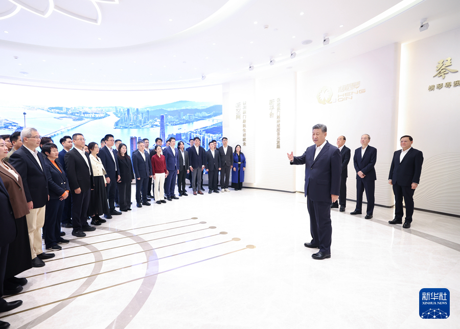 12月19日上午,中共中央總書記、國家主席、中央軍委主席習近平在澳門特別行政區行政長官賀一誠陪同下,來到橫琴粵澳深度合作區考察。這是習近平在橫琴天沐琴臺展示廳考察時,同參與橫琴粵澳深度合作區規劃、建設、管理、服務等各方面代表親切交流。