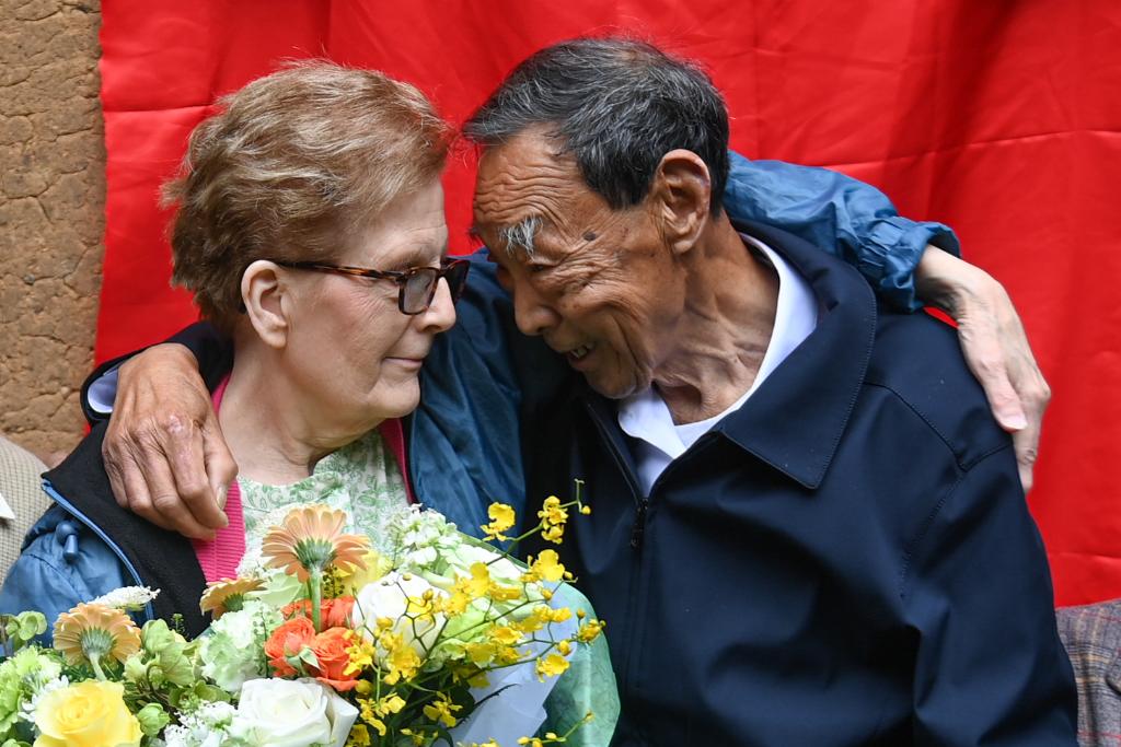 2024年4月17日,在浙江衢州江山市張村鄉龍頭店村,“杜立特行動”3號機領航員查爾斯·奧祖克的女兒蘇珊·奧祖克(左)與村民廖明發相擁。1942年,村民廖詩原(廖明發的父親)一家曾悉心照顧跳傘降落的查爾斯·奧祖克。新華社記者 黃宗治 攝