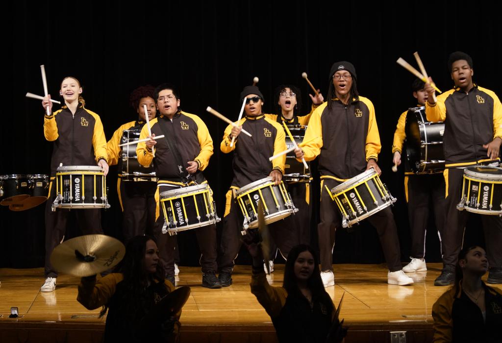 2024年1月30日,在美國華盛頓州林肯中學,學校鼓樂隊在美國中學生赴華交流歡送儀式上表演。新華社記者 吳曉凌 攝