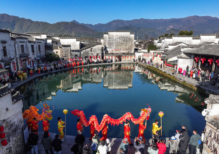 2025年1月18日,民俗表演隊在安徽省黃山市黟縣宏村巡游(無人機照片)。新華社發(施亞磊 攝)