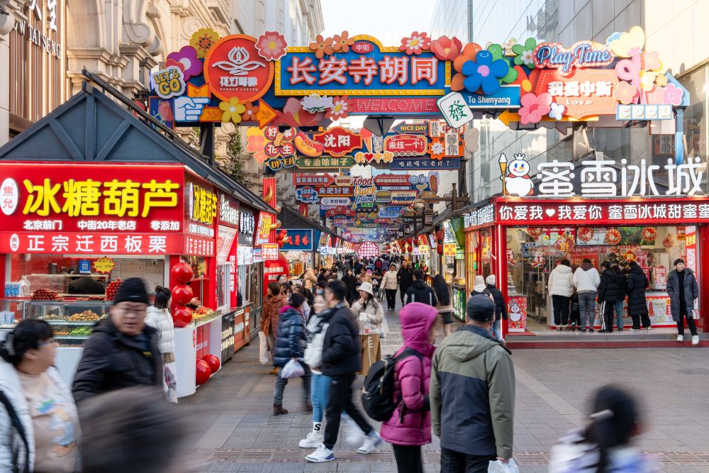 2025年1月22日,游客在沈陽中街長安寺胡同小吃街游玩。
