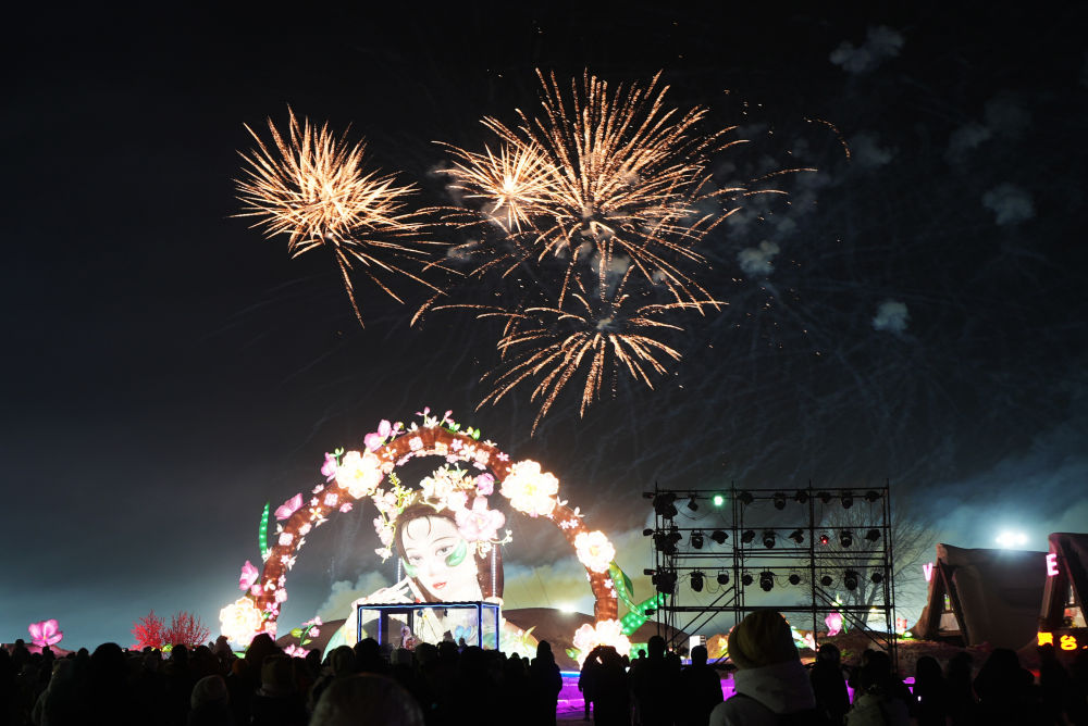 2025年1月12日,游客們在沈陽沈北新區稻夢小鎮觀看焰火表演。