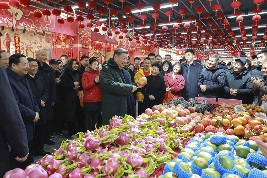 1月22日至24日,中共中央總書記、國家主席、中央軍委主席習近平冒著嚴寒來到遼寧,看望慰問基層干部群眾。這是23日上午,習近平在沈陽大東副食品商場考察。新華社記者 謝環馳 攝