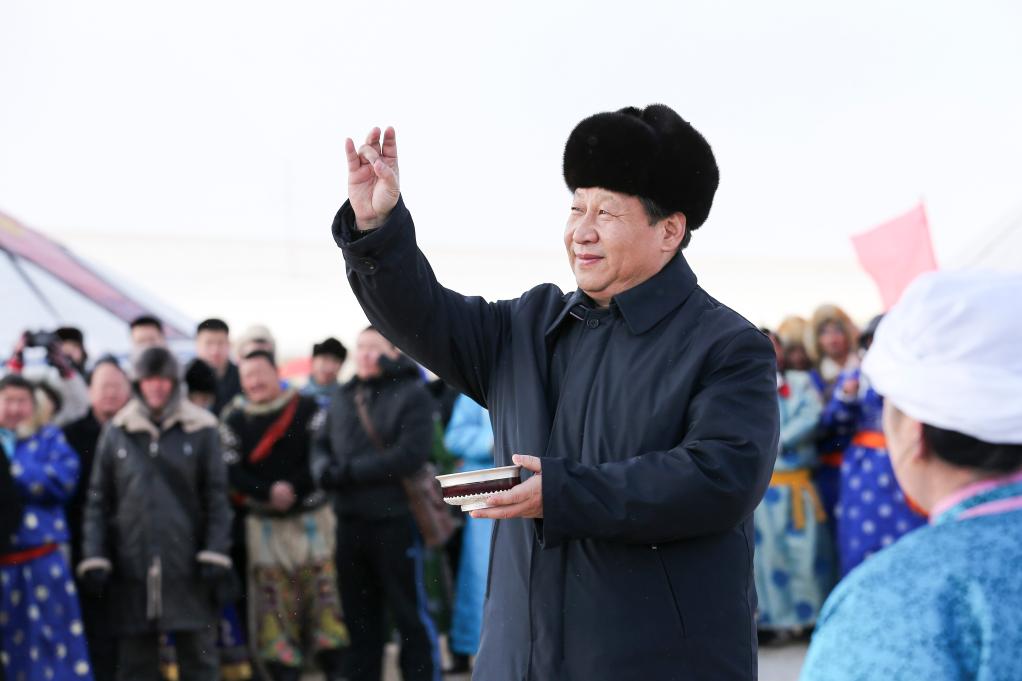 2014年1月,習近平總書記在內蒙古調研看望慰問各族干部群眾。按照蒙古族習俗,總書記用無名指蘸上用銀碗盛著的鮮牛奶彈了三下,借“五畜祈?!痹⒁?,祝福來年風調雨順,五畜興旺,人民幸福安康。