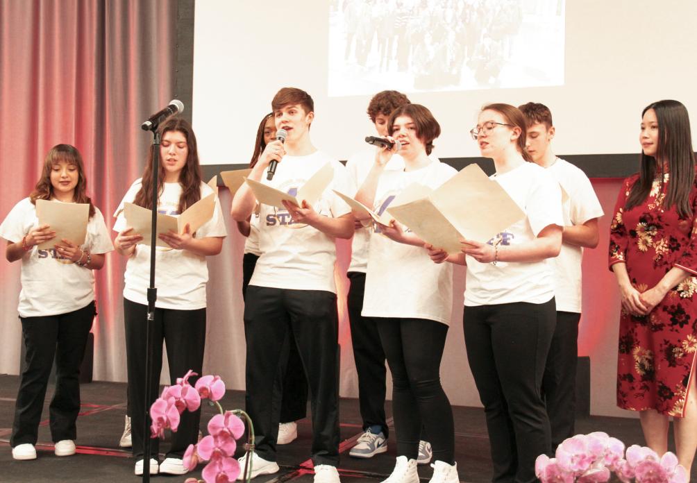 2024年2月27日,在美國芝加哥,馬斯卡廷中學學生用中文演唱《情緣留住永恒的記憶》。新華社記者徐靜攝