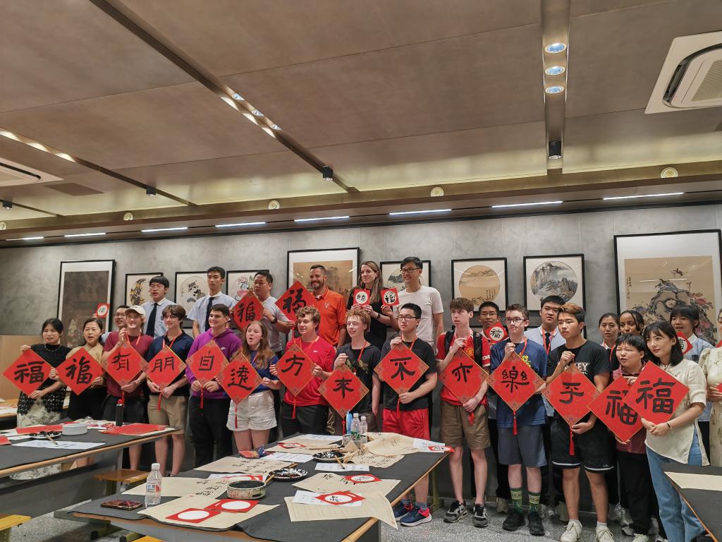 2024年6月8日,在河北省石家莊外國語學校,美國艾奧瓦州中學生“友誼傳承”研學團的學生們體驗漢字書法課后合影留念。新華社記者杜一方攝