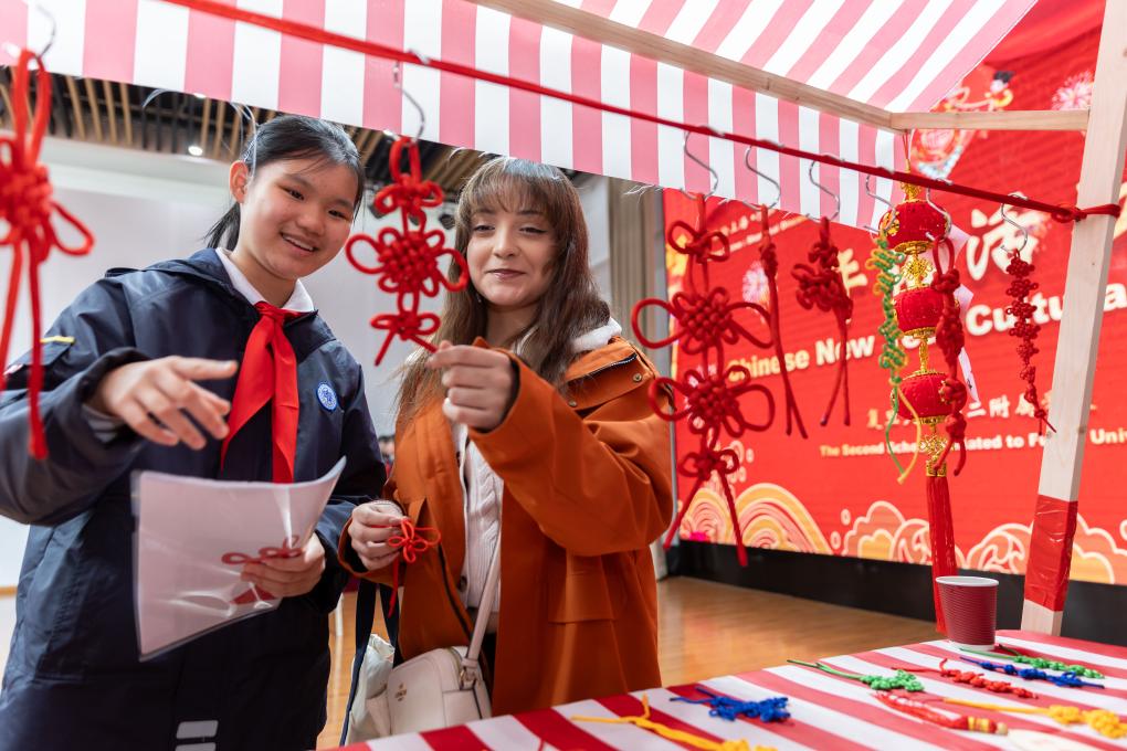 2024年1月28日,復旦大學第二附屬學校學生(左)為美國馬斯卡廷中學學生(右)介紹中國結。新華社記者王翔攝